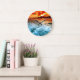 Unik, trendig, moderiktig, dekorativ och söt väggklocka. Med en vacker contemporary som målar upp turkos, ljus och mörk blått, och färgad med ljus orange, solnedgång för surfa i havet. Made till havets surfare, semester eller strand älskare. Färgfull och söt barn, mamma eller pappa födelsedagspresent, Mor eller Fars dag eller julklapp. Eller bara originalkonst, coola och roligt för att dekorera din masterbostad eller barnens sovrum, daghem, boende- eller familjerum, loggstuga, strandhus, land stuga, flod- eller sjö semesterhem eller kontor med.