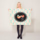 En filt med en söt orange rävbild inuti en svart oval. Han bär en röd tomtehatt och har prydnadstecken på sin svan och på andra sidan bröstet på grönten. God jul är också skrivet i ovala ram. Bakgrunden är mönster i julgranar och prydnadsämnen på en gräddbaksida i färgaden.