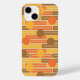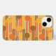 Den här telefonväskan har en modern design i mitten av århundradet av upprepade rektanglar i orange, guld och brunt med cirklar som är översta.