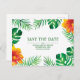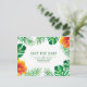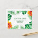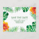 Spara vykortet Date som innehåller tropiska löv och orange hibiscus blommor på svart. Anpassa den här designen genom att ändra text, färg och bakgrund färg. Du kan till och med lägga till text på baksidan.