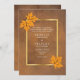 Orange Maple lämnar på brunt nedfläckad grunge papper rustik bröllopsinbjudan eller inbjudan med ett guld-ram på brunt bakgrund och orange Maple löv på hörnen. Den här eleganten är ett modernt fallbröllop med ett vintage-fläkt en del av en bröllop-uppsättning eller samling och är en helt anpassade perfekt för en höst bröllop.