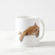 Porträtt i en orange tabby katt domestic-kortslutning som ligger på en vit bakgrund med tass nedbrutet över bord