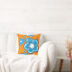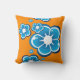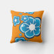 Den ljusa och färgrika blommigten kudder med blåa blommor och en orange bakgrund.