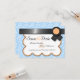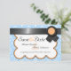 Vackert bröllop spara datum med ljusblå och vit dammkastsmönster och en svart ribbondesign med orange överst.