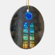 En dubbelsidig hängande prydnad som kommer med ett handlag av Antoni Gaudis varma och underbara Barcelona till din julgran. Shows för varje sida ett ljust tänt målat glassfönster, en närbild i brännhet orange eller drar tillbaka vidare i deppighet, från Sagradaen Familia
