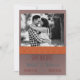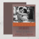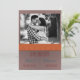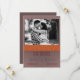 Inget säger höst som bränd orange och brun. De här färg är en perfekt för ett fallbröllop. Det platta datumkortet Save the Date är designat för att inkludera ett foto av lycklig-paret som ramats in med ett brunt överlägg. Den bruna ram har ett kornigt struktur. Ett färgband för bränd orange separerar bilden ovan från detaljerna nedan. Bandet innehåller en mönster av röd, sage och blå linjer-korsande korsande.