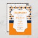 Oversifierad elegant mönster i färg av orange och marin blått satte bakgrunden till denna söta babyduschdesign. En vit baby-karosseri har all text skriven på den för det stora evenemanget, som kan vara en par-dusch eller bara för mamma. Utformningen kommer i sjön och grått, bränd orange och grått, rött och svart, grönt och svart, orange och flotta, grönt och gult samt lila och grått. Matchande produkter är tillgängliga.