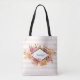 En totepåse med persika och vit strimlad bakgrund. Designad med en orange och rosa blommigt arrangemang med grönt löv. En diamantformad ram överst med personligen namn inuti.