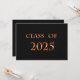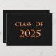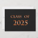 Kort 2025 med svart struktur för bakgrund och orange för namn. Baksidan är ett svart struktur med orange för tillkännagivande för studenten.