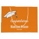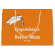 En graderingshatt är ovanför anpassadet student namn i vit text på orangens bakgrund. I vittexten står det "Grattisar". Du kan anpassa årsklass.