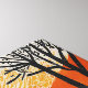 I den här teckningen visas ett ökenlandskap med en hög, svart accti som ställs in mot en livfull bakgrund av varm orange och coolans blå vattenfärg tvättar. Kaktuset illustreras i ett linocut stil, med djärvt, mörk linjer och detaljerat struktur, i kontrast till det mjuka, flytande färgen i himmel. Den cirkulära, moppelliknande mönstren i bakgrunden tyder på en sol eller en värmeböljeeffekt som ger en stark känsla av värme och torrhet på scenen. Fintvätt, blyfritt träd och sprickor i ökenbottnen kompletterar det torra, skonsamma landskapet.