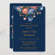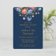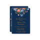 En vattenfärgad illustration av en ljus bukett i marinblått och orange. Buketen består av människor med stora, runda blommor och djup grönt löv. Bakgrunden är marin blå. Matchningsinbjudningar och bröllop-leveranser finns i den här samlingen