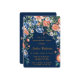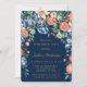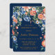 En vattenfärgad illustration av en ljus bukett i marinblått och orange. Buketen består av människor med stora, runda blommor och djup grönt löv. Bakgrunden är marin blå. Matchningsinbjudningar och bröllop-leveranser finns i den här samlingen
