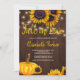 Rustik modern gult och bränd orange vattenfärgad hand målade solblommor och pumpa Fall i Kärlek inbjudningskort för möhippan med chic gyllene manusbokstäver och strängar av tvillinglå ljus på en mörk brunlingslemera. ++++ Lämpligt för höstfall möhippa party.
