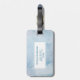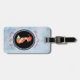 Personlig bagagetikett med en söt orange räv illustration inuti en svart oval. Han har en röd tomtehatt på sig och har festliga gröna dekorativa accenter på sin svans och över bröstet. God Jul och gott nytt år skrivet i böjd text längs toppen och botten. Bakgrunden är i en vintage-liknande blågrå färg med ett urblekt prickmönster längs toppen och botten.