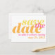 Gör ditt stora bröllop-meddelande med den här djärva contemporaryn och spara datumvykorten. Texten "spara datumet" och dina viktiga uppgifter om bröllop är inskrivna i moderna, smakfulla teckensnitt. Ta med ytterligare information eller ett personligt meddelande på baksidan. Spara av miljön och porto med hjälp av dessa spara datumvykorten.
