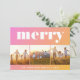 Skämmande minneskort med rosa till orange övertoningsbakgrund, en rad med tre fyrkantiga foton och "merry" skriven i trendig fet vit modern typografi. Du kan anpassa namnen och året i ren vit typografi.