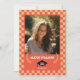 Meddela din examenstagares milstolpe med stil genom vårt Orange Rutig Custom Foto Meddelande Platt Kort. Denna livfulla och unika design har ett djärvt rutmönster i orange nyanser, som ger en lekfull men ändå elegant bakgrund för ditt speciella meddelande. Lägg till ditt personliga meddelande på baksidan!