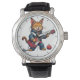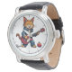 En grafisk bild av en söt vit kattunge som spelar en rosa gitarr Kattungens uttryck är lekfullt,