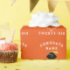 Kreativ studenten klackar för klass "25 grad" med svart studentmössa med guld tassel på orangens bakgrund. Om du vill anpassa redigeringstexten så att namn läggs till.