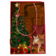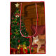 Den orange tabbykattungen, med lite vit på hans bröstkorg och ansikte, sitter i en stol vid julgranen, och julklappar som ut riskerar den som all hans in typisk kattmode, gåva för helgdag för kattälskarejul, hänger lös