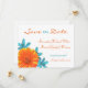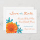 Skräddarsydd spara datum med en blomsterinspirerad orange och teal design.