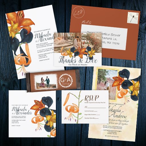 Orange Tiger Lilies, Mörk blått Calla Lilly Bröllo Inbjudningar