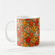 Mugg har en konsdecodesign av tulpaner från pentagoner och trapezoider i olika orangar.