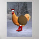 pappa jul har en söt kyckling som hjälpare i år - marscherar gärna med röda stövlar och hatt genom snö under vintern