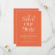 Snyggt och elegant sparar datumkortet med typografiktext som säger "spara vårt datum" i bränd orange färg. Du kan lägga till ett foto på baksidan.