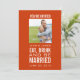 Orange Vita moderna fotobröllopsinbjudningar med mat, dryck och vara gifta tema. Elke Clarke©. Endast exempelbild. Ersätt med ditt eget. Lägg till din bröllopsinbjudningstext på kortets baksida. Använda meddelandena eller välj "anpassa" om du vill ha fler redigeringsalternativ.