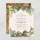 blommigt för Orange av citrusvattenfärg och bröllop spara datum-kort för löv. Vackra handtryckta blommigtens vattenfärger och modern skripttext. Modern på trendvändningen är att förtvivla färg.