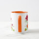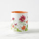 Ett ljust, färgat kaffe mugg som dekorerats med rödmålade daisy, orange nasturtium och en honungsbin som målas i vattenfärg.