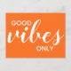 Good Vibes Endast positiv bekräftelsetypgrafi av citattecken har en enkel modern design på en orange med trendigets kalligrafi och skript i vitt. Bekräftelse uppmuntrar i synnerhet motivation och inspiration i tuffar och fungerar som en påminnelse om att övergå till ett positivt tänkesätt. Bakgrund och färg är lätt att ändra i designområdet verktyg. Annan tillgänglig färg. Utformning tillgänglig för andra produkter.