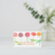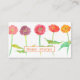 Ett muntert affärskort som dekoreras med fem zinkblommor i röda nyanser, rosa, orange och lila som är målade med vattenfärg och med spatter i bakgrunden för tillsatt färg. På Blommor zinnias elak tankar på frånvarande vänner. Öga-fånga färg för nätverksarbete och affärsfrämjande åtgärder.