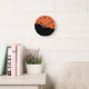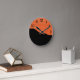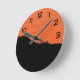 Orangens tegelvägg med svart målningsfärg rund klocka
