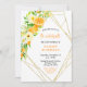 This fun and whimsical birthday party invitation features watercolor oranges, daisies and foliage on a gold geometric frame. The text combines handwritten script and serif fonts for a stylish and modern look. This is perfect for a summer rustic birthday party.
