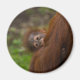 En orangutan baby som sitter nära mor har en kik bakom axeln. Hans vackra öga är blankt och ljust och det roliga frizzy-hår som nyfött spädbarn har.