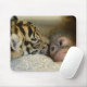 Gullig orangutan- och tigerungeunge som tillsammans kelar. Fullständigt anpassade.