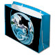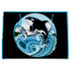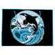 En orca som hoppar ut ur havet med vatten överallt. Bergen och blå himmel runt den dödliga valen som dras i art nouveau tatuering stil.