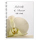Anpassa anteckningsboken för elegant Orchid Flower på White Bröllop Spiral med bridens och brudgummens personliga namn och datum för att skapa en unik planerare, råd bok till nylingarna eller gäst bok för deras giftermål-ceremoni. Den här klassanpassade botaniska anteckningen bok har ett blommigt foto av en vit blommar av halvklotblomma med vit bakgrund.