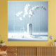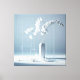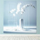 Eine ruhige Komposition aus weißen Orchideen vor einem geometrisch strukturierten Hintergrund: Die zarten Blüten entfalten sich in einer schlichten Vase, während feine Linien und rechteckige Formen im Hintergrund eine klare, architektonische Ordnung schaffen. Die helle, fast monochrome Farbwelt aus Weiß und kühlen Nuancen erzeugt eine Atmosphäre von Leichtigkeit und Konzentration. Ideal für moderne Räume, die florale Eleganz mit strukturiertem Design verbinden möchten