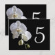 Anpassa den här eleganten Orchid på svarta Bordsnummer och skapa ett annat kort för varje bord vid mottagningen, möhippan eller party i giftermål. Dessa bordsnummer för blomsterodling i anpassningsbar har ett fotografi av blommigten med vita blommar av halvblommor eller blommor på stjälken med svart bakgrund.