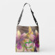 Orkidéerna blomstrar igen i trädgården, i originalfotot av ZoeSPEAK på korsningen Tote Bag. Blommorna, som kommer från en böjd grönt, har lilor som blandas i gult vid petens. Den naturliga träbakgrunden avger skulpturer och färg.