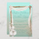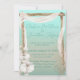 Den här bröllopsinbjudan har ett romantiskt strandtema. Bakgrunden har en övertoning som liknar en tropisk havsstrand eller ö. En boho arch av trä och chiffon är i mitten. En stor vattenfärgad stam av vita orkidéer från stil placeras på den lämnat.