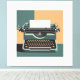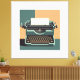 En skrivmaskin för vintage avbildas med en lakan av papper infogad, inställd mot en kontrasterande geometrisk bakgrund av teal- och persiktenntoner. Stil betonar rent linjer och en retro-estetik.