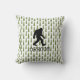 Oregon Bigfoot Pillow har en bakgrund av oliv grönt fir träd och har en silhuett av Bigfoot med ord "Oregon" i ett svart, tryckt skrivmaskin stil. På baksidan finns tre samordnande träd.