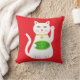 Denna fantastiska kudde har en grafisk designbild av en lyckosam orientalisk vit vinkande katt. Katten har vackra gyllene ögon och bär en gyllene medaljong runt halsbandet. Katten har rosa öron och morrhår. Denna söta lilla katt håller en gyllene symbol med grön jadeinläggning och ett meddelande i gyllene text som säger "Lycka till". Mönstret är utbrett över baksidan av kudden.
