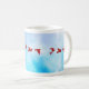 mugg med blå vattenfärgbakgrund och röda origami-fåglar. Mugg är cylindrisk till formen med ett vitt handtag och ett vitt insida. Bakgrunden är en ljusblå vattenfärg som tvättar. Det finns sex röda origami-fåglar som är spridda över bakgrunden. Mugg är på en vit marmor yta.