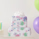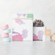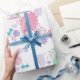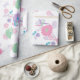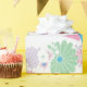 En papprare förpackning med japansk design av papprare origami-kranar och blommor i rosa, lila, grönt och blått mot en papprare struktur.